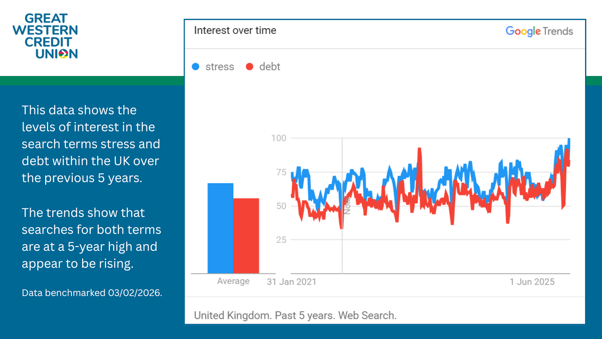 Search trends reflect this too. In partnership with Varn, weâve been looking at how people are using Google, and searches for âstressâ and âdebtâ are now at their highest point in five years. Itâs a clear sign of how stretched people are feeling, and how finances are weighing heavily on everyday life.